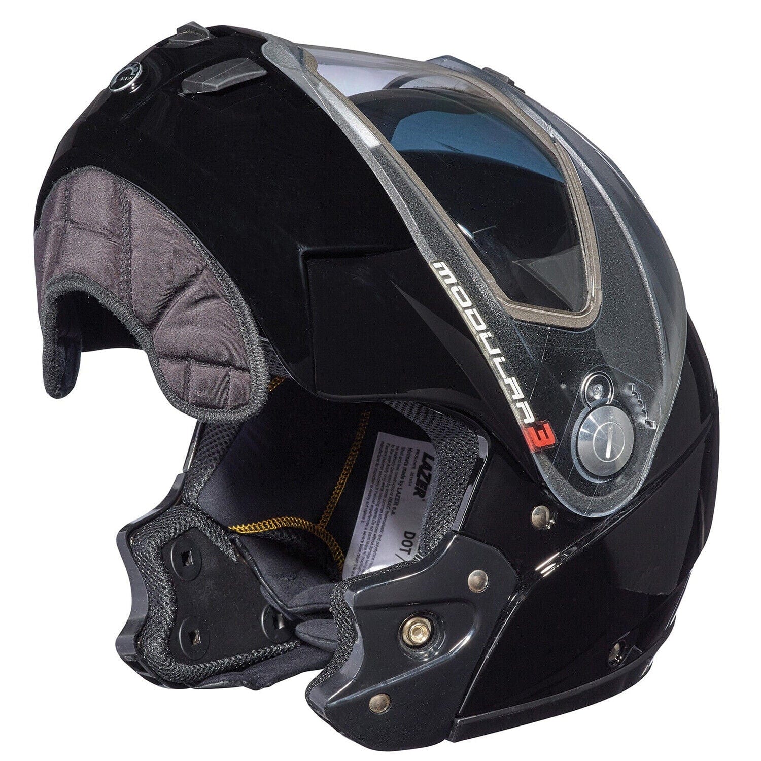 The Ski-Doo Modular 3 SE electric snowmobile helmet incorporates a large eye opening for great peripheral vision. Its dual lens visor uses built-in Clear Vision Technology for a distorsion free, optically-correct view. The unique retractable sunshield raises and lowers at the touch of a button. 4-year limited warranty. 4-year limited warranty. Built-in Clear Vision Technology with optically-correct dual lens visor. Ready to receive communication system. Adjustable sunshield lowers or raises at the touch of a button. Front push-button release integrated into jaw section. Breath Evac fog-resistant mask system. Quick-release chin strap. Spacious design allows room for eyeglasses. D.O.T. Certified---