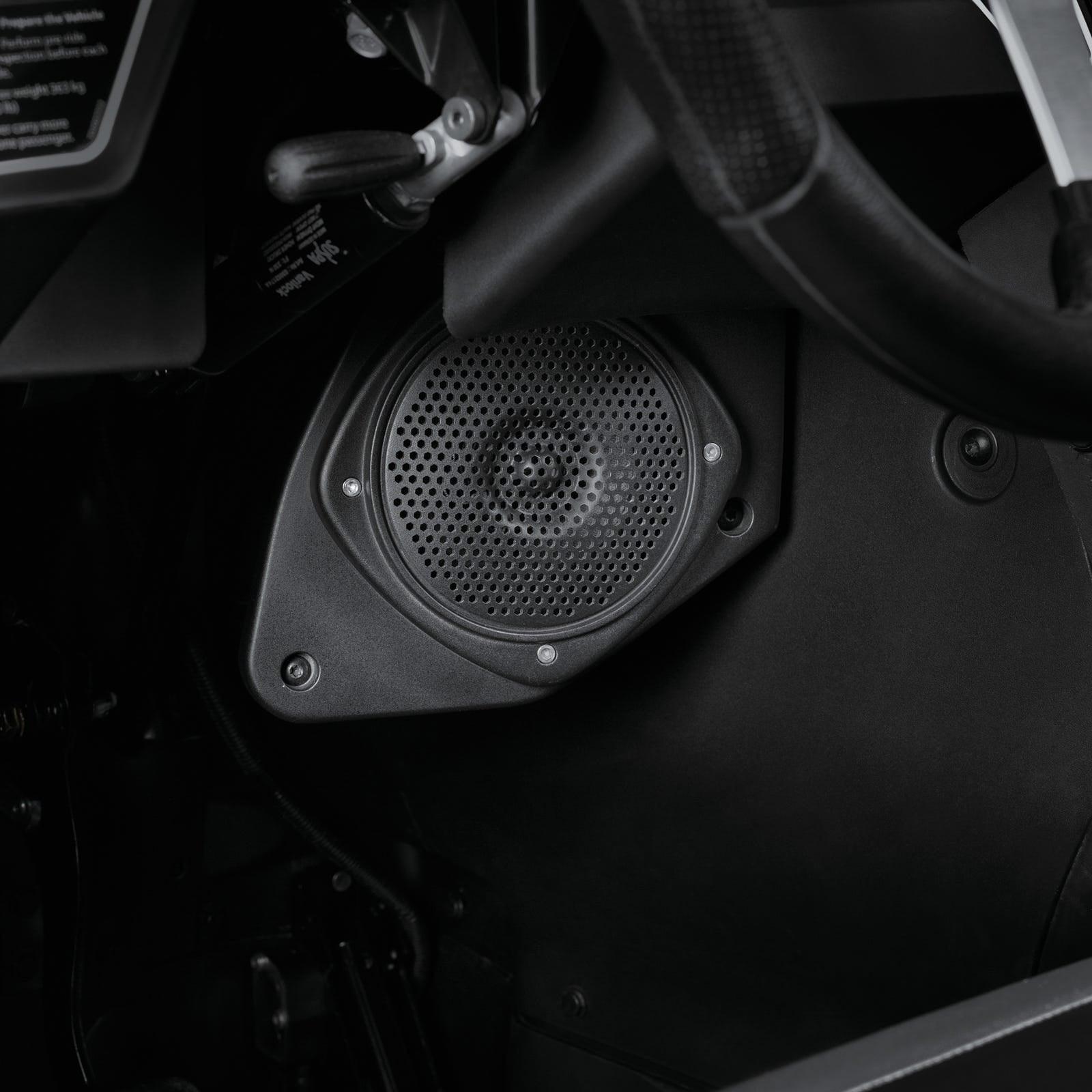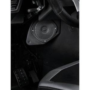 Front 5.25" (13 cm). Great sounding outdoor speakers. Kit includes black speaker boxes and plug-and-play wiring. Set of 2. Standard on Limited model. Included in the complete audio system. Commander, Commander MAX 2020 & prior, Maverick, Maverick MAX