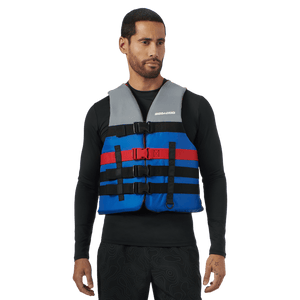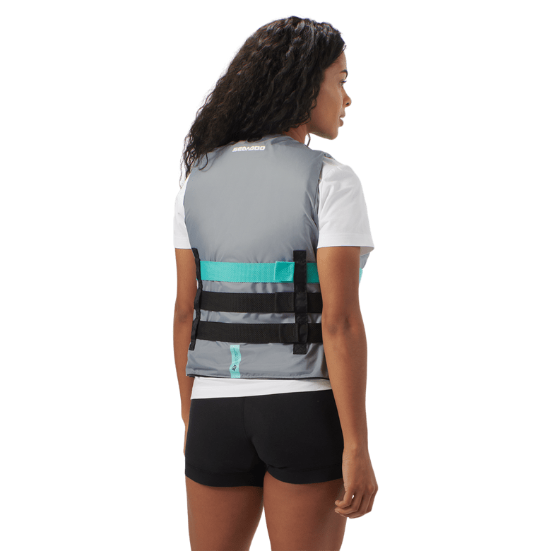 Navigate your favorite lake activities in this unisex PWC life jacket. The Sea-Doo Navigator PFD is a unisex life jacket that's crafted from a lightweight and quick-drying polyester shell with expandable and comfortable polyethylene foam inserts. The dual-sized design makes sharing easy,. Plus, large-cut armholes allow for a full range of motion. Completing this Coast Guard-approved Sea-Doo PFD are features like a goggle attachment loop and key lanyard D-Ring.